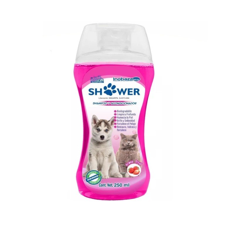 El Shampoo Acondicionador Ecológico Shower Aroma Chicle 250 ml de Inobazz Pharma es un producto de higiene veterinaria diseñado para limpiar, acondicionar y perfumar el pelaje de perros y gatos, brindando una experiencia de baño completa en un solo paso.